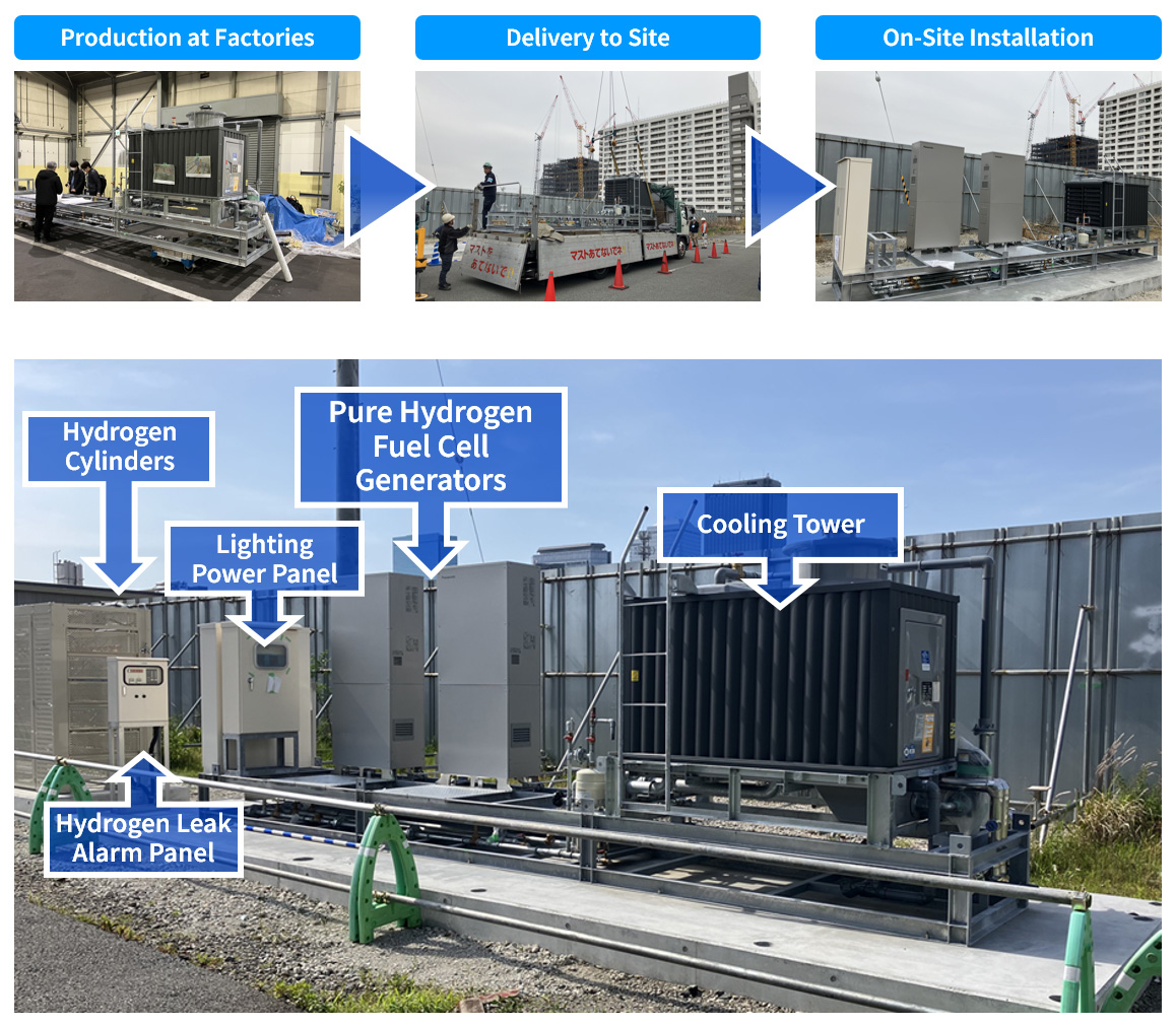 سیستم نصبشده در مرکز بازرسی مورینومیا شامل 100 کیلووات توان خورشیدی و 10 کیلووات توان از ژنراتورهای سلول سوختی هیدروژنی خالص است که در مجموع 110 کیلووات برق تولید میکند. این برق به پست برق مرکز منتقل میشود و با سیستمهای کنترلی و نظارتی اختصاصی، عملکرد تجهیزات و تولید انرژی بهدقت پایش میشود. این سیستم در رویداد «مترو موبیلیتی تاون» که در منطقه مورینومیا برگزار شد، برای نمایش چشمانداز متروی اوزاکا در حوزه حملونقل و زندگی آینده بهکار گرفته شد.